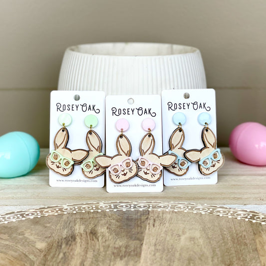 Easter Bunny with Glasses Laser Engraved Wood Dangle Earrings