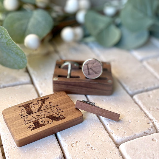 Personalized Wood Cufflinks & Tie Clip Gift Box Set