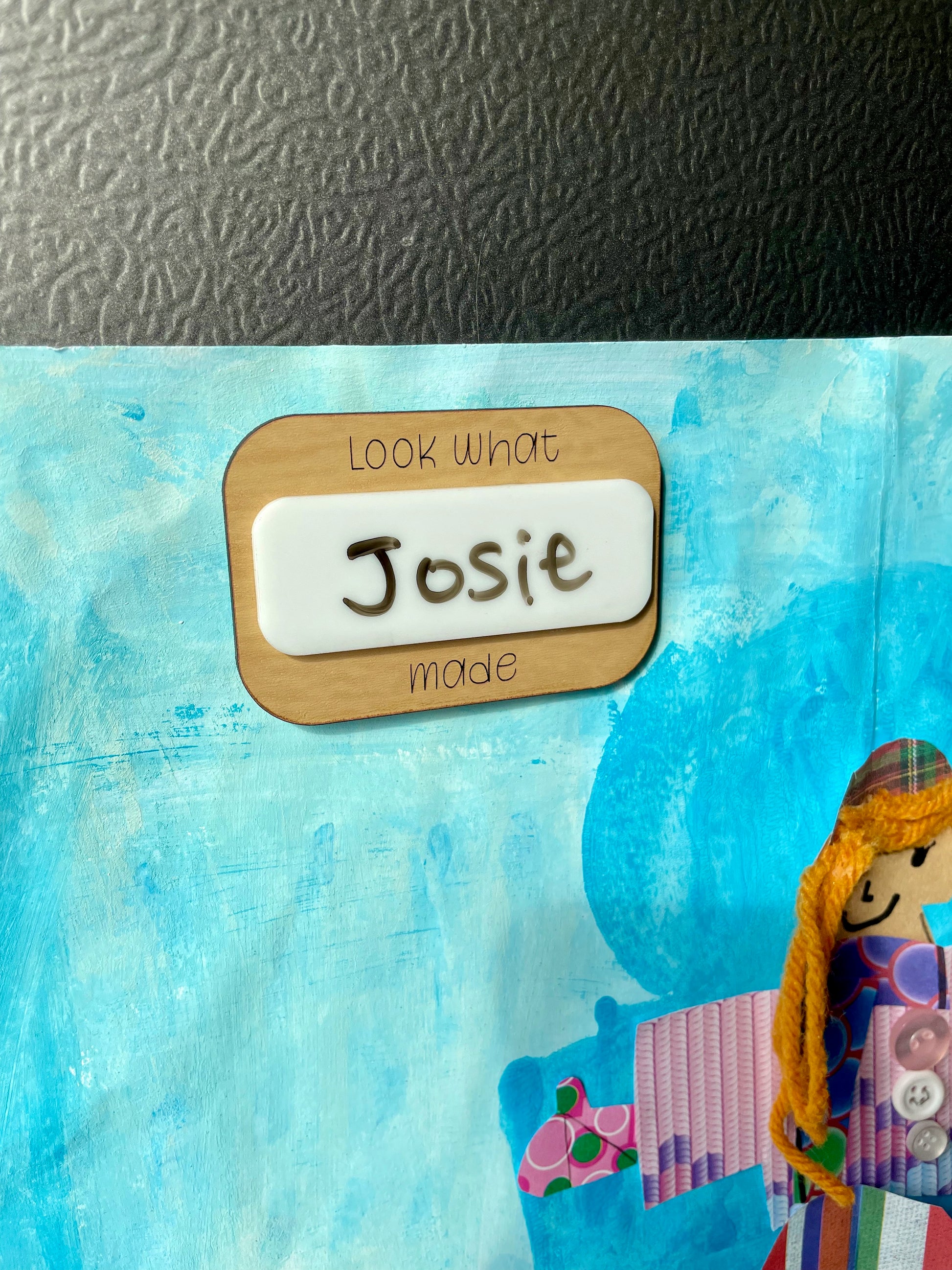Showcase your children's artwork with their own personalized magnet! This magnet features a dry erase piece where your child can write their own name. *Note - you must use a dry erase market if you want to be able to erase the name. Any type of cloth or wet wipe will erase the name.