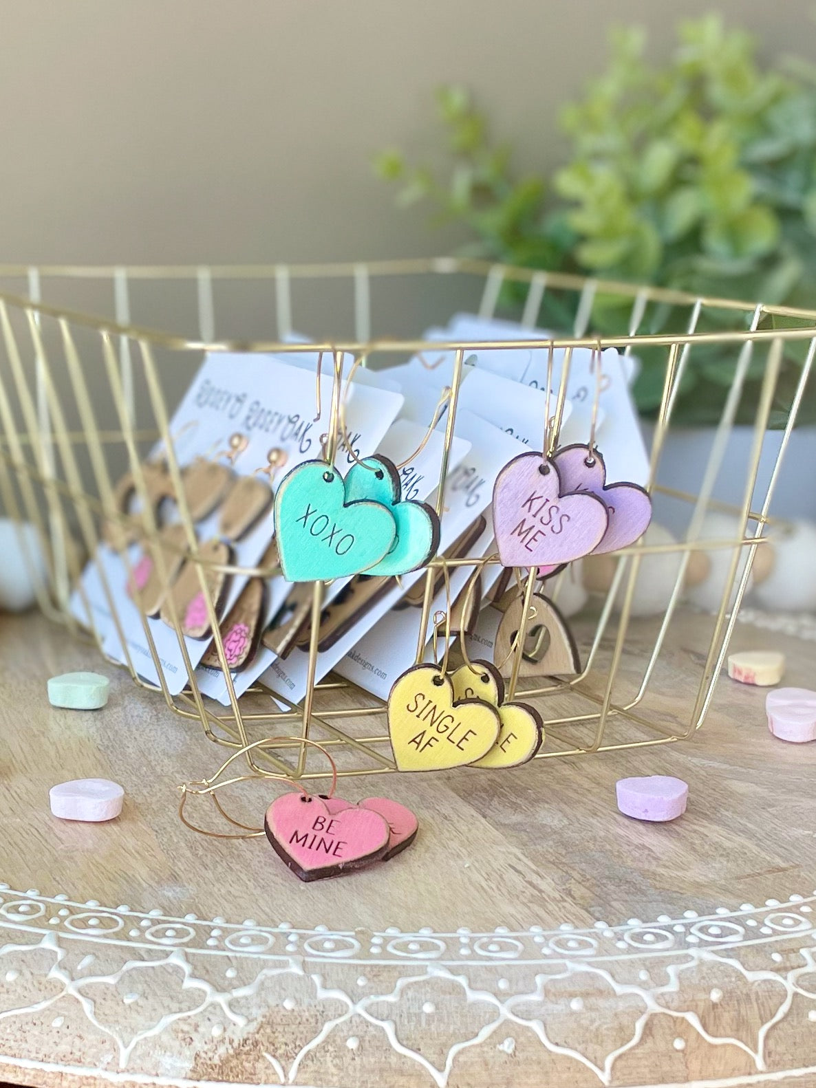 Conversation Heart Laser Engraved Wood Dangle Earrings
