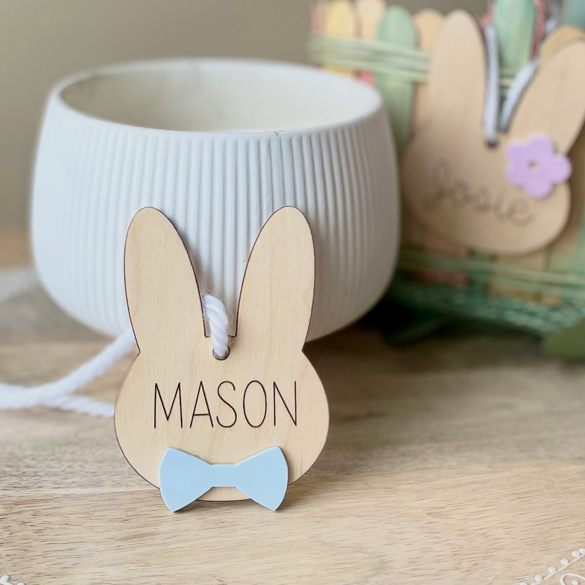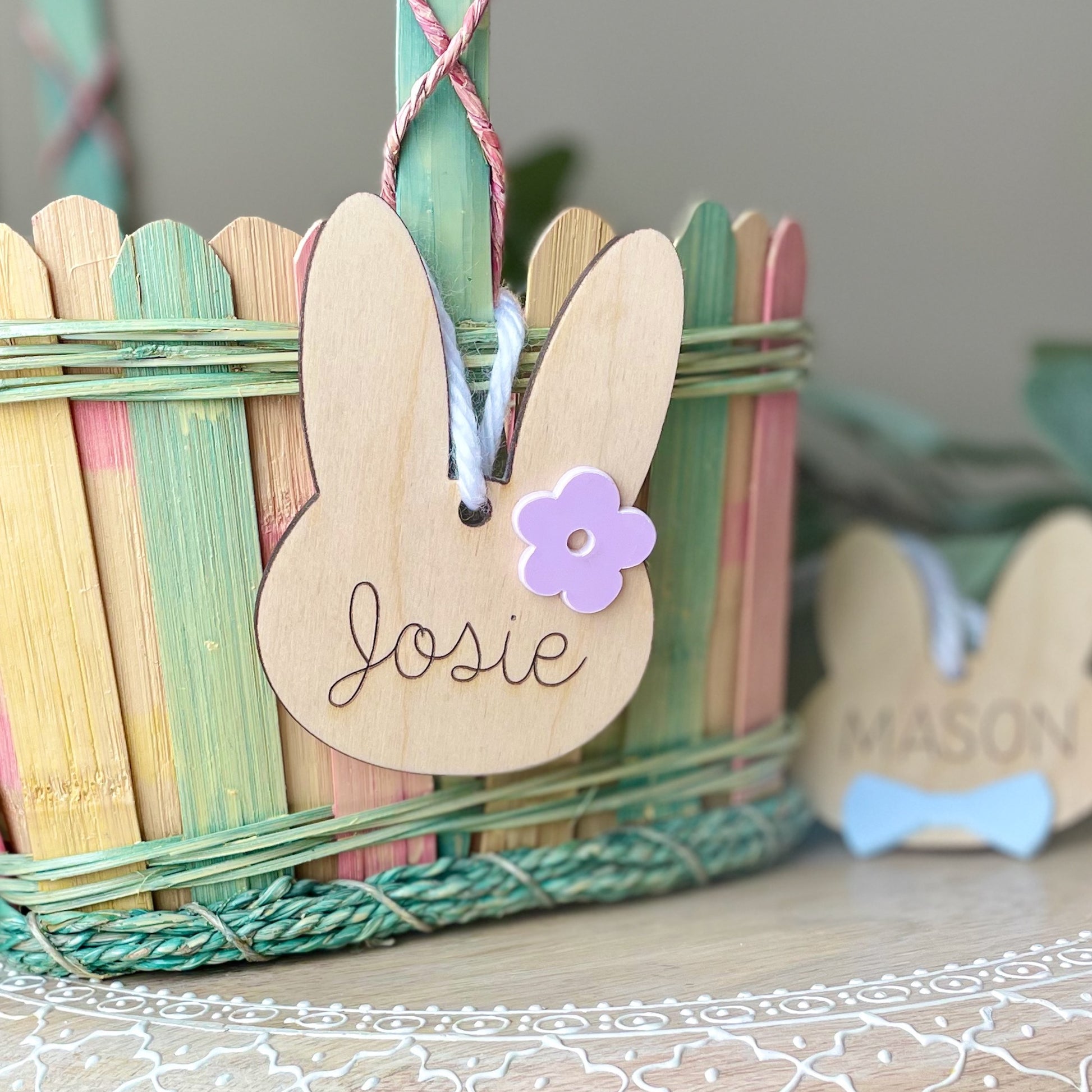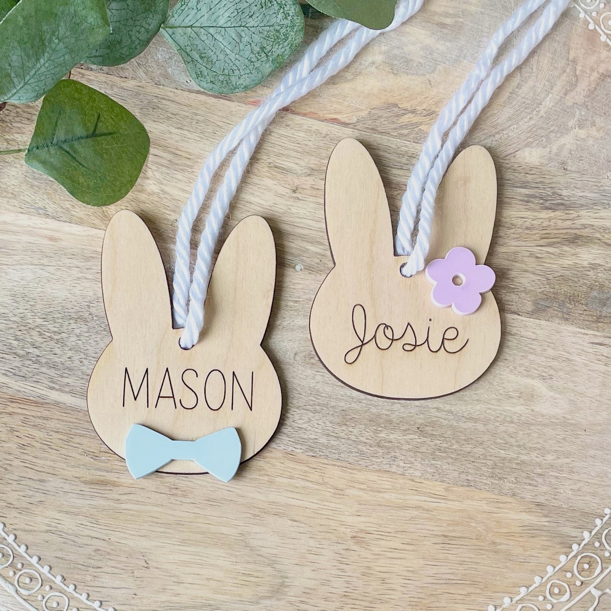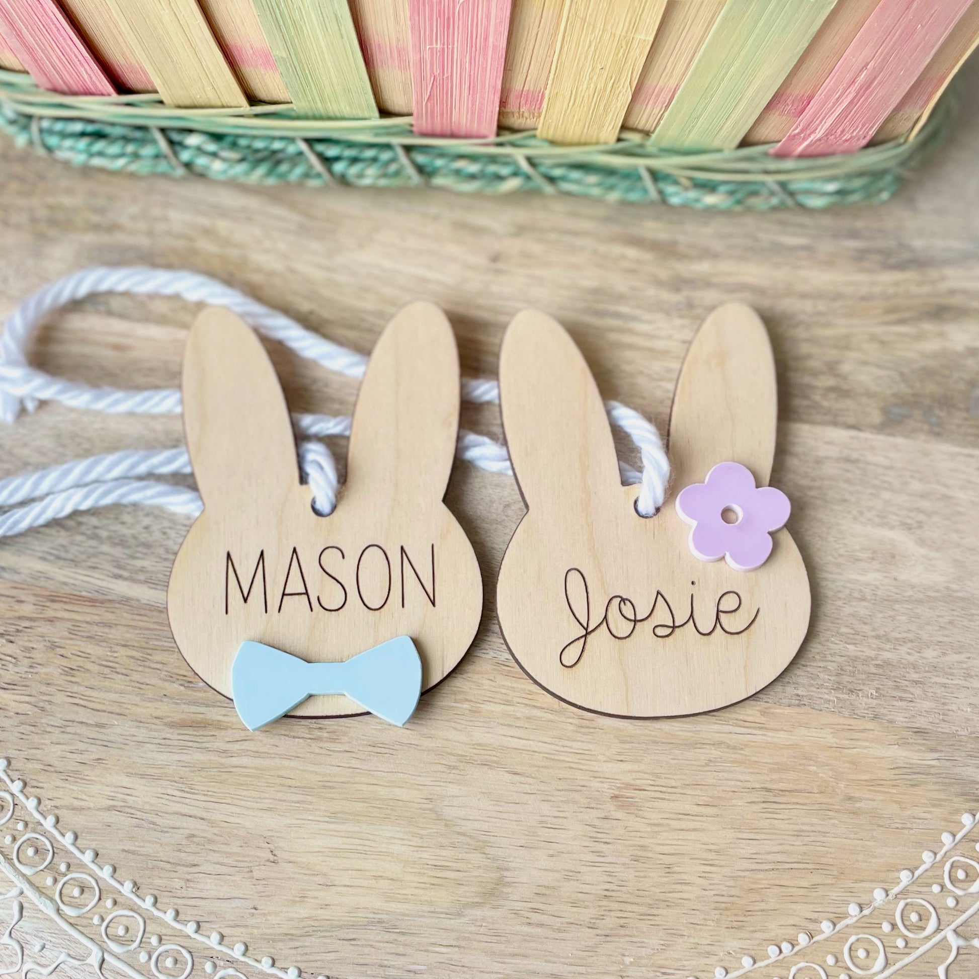 Our tags feature a name engraved into the wood and your choice of a cute acrylic bow tie or flower. Each tag comes with ribbon making them ready to hang on your basket!