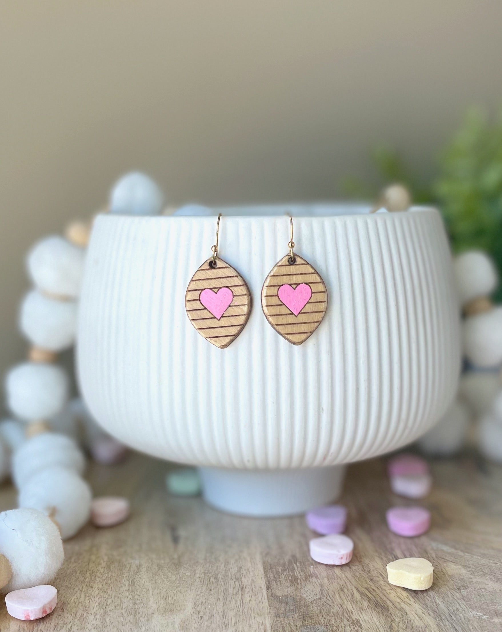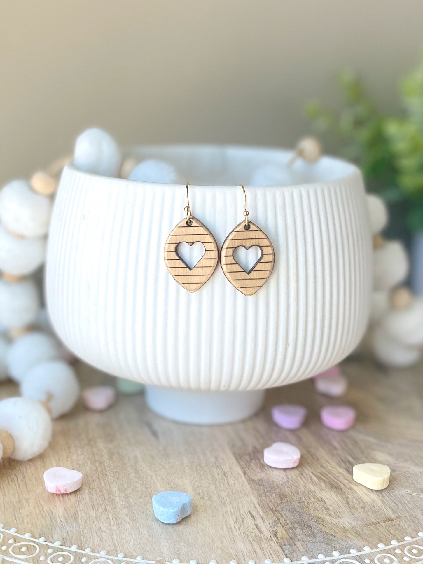 Dainty Heart and Stripes Laser Engraved Wood Earrings