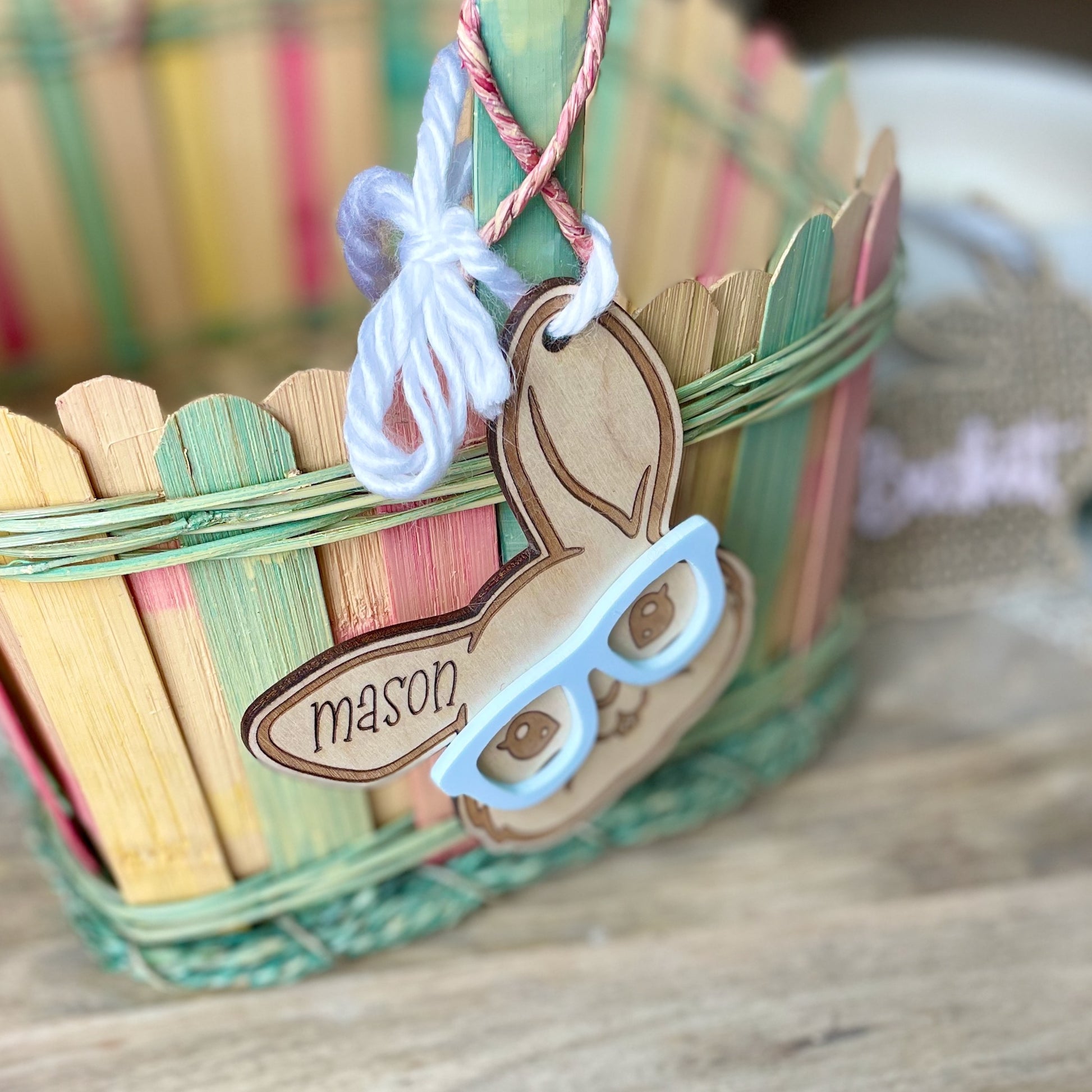 This personalized basket tag features your name engraved into the wood and cute acrylic glasses. Each tag comes with ribbon making them ready to hang on your basket!