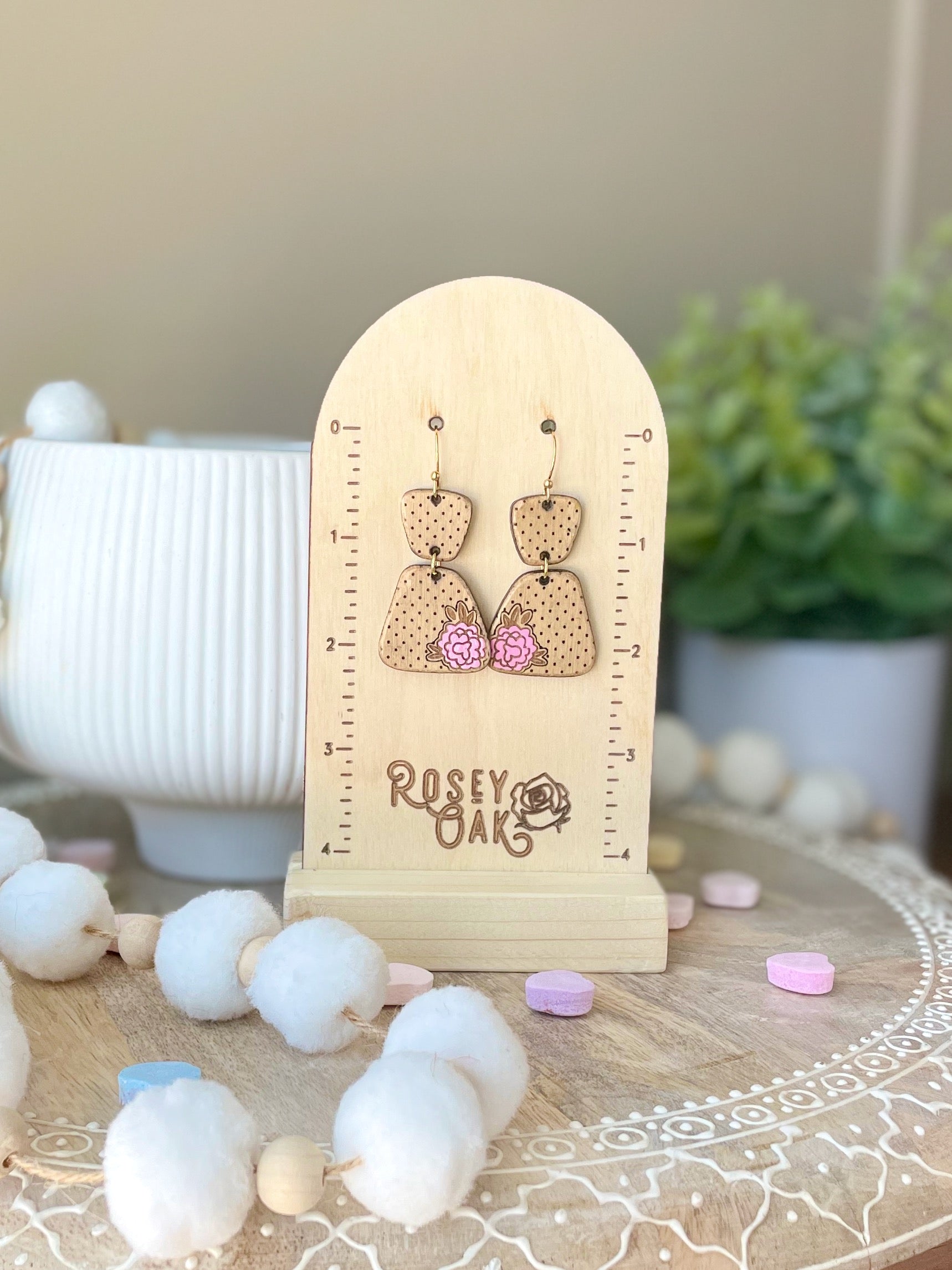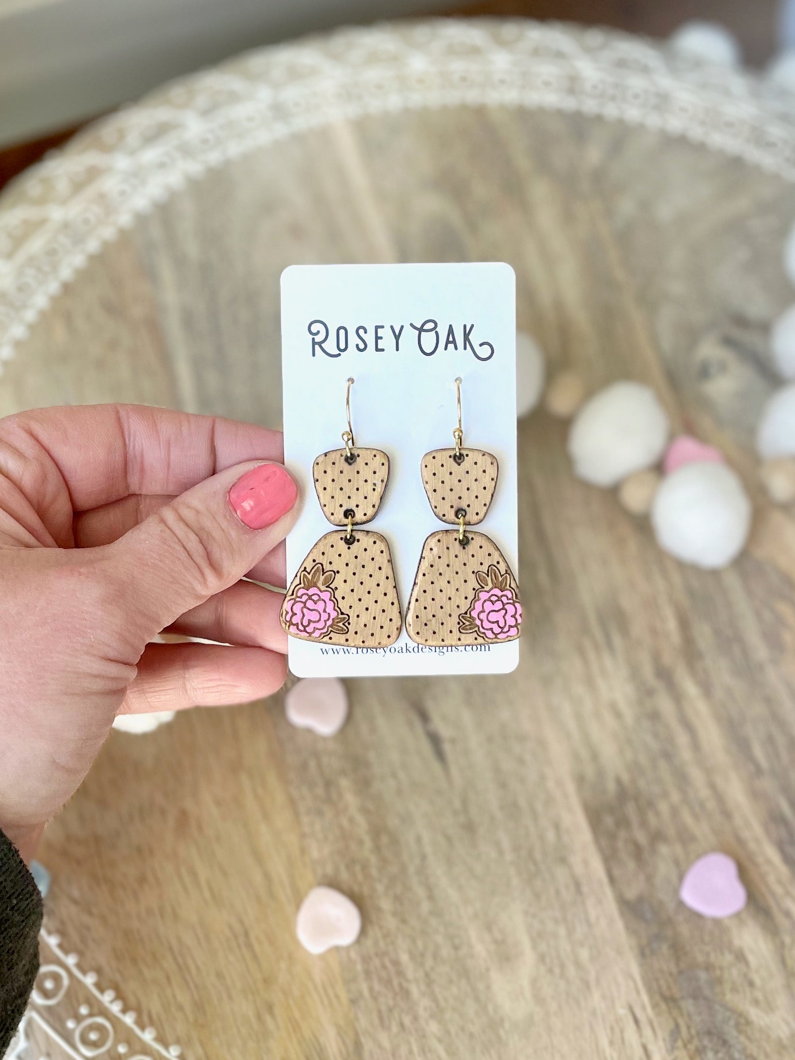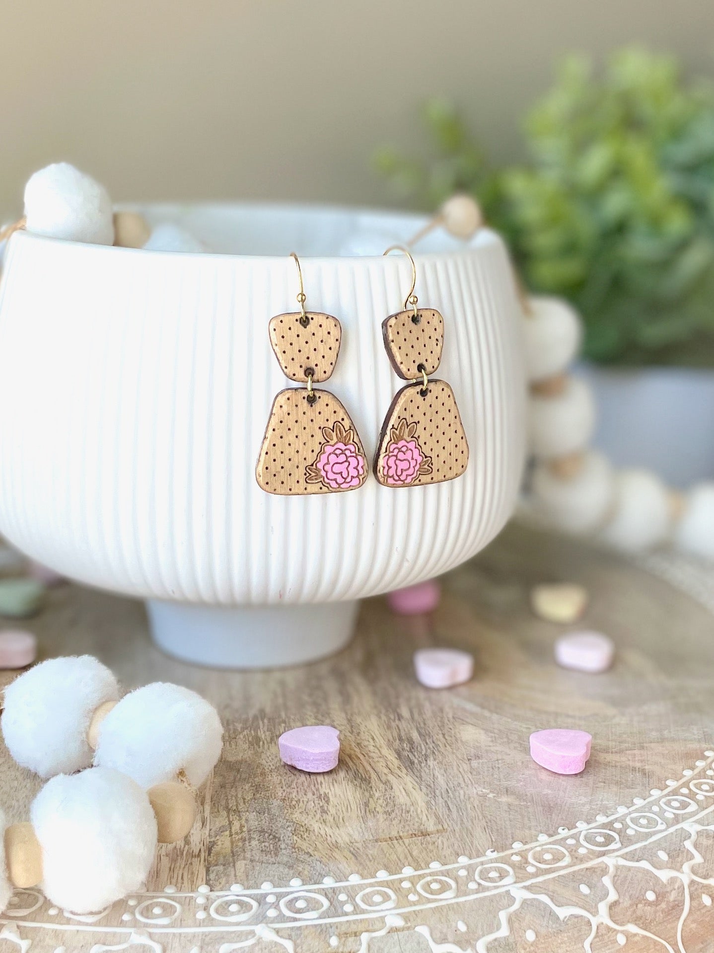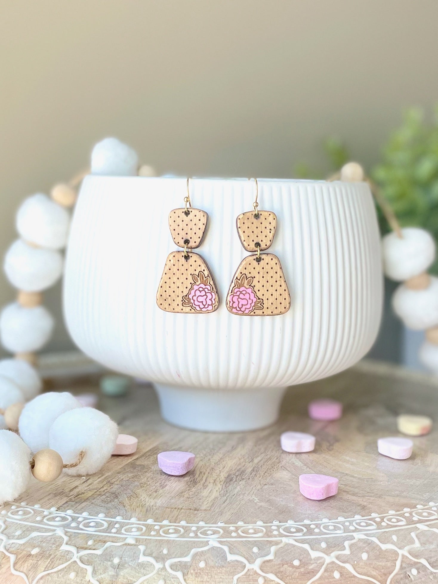 Flower Polka Dot Laser Engraved Wood Dangle Earrings