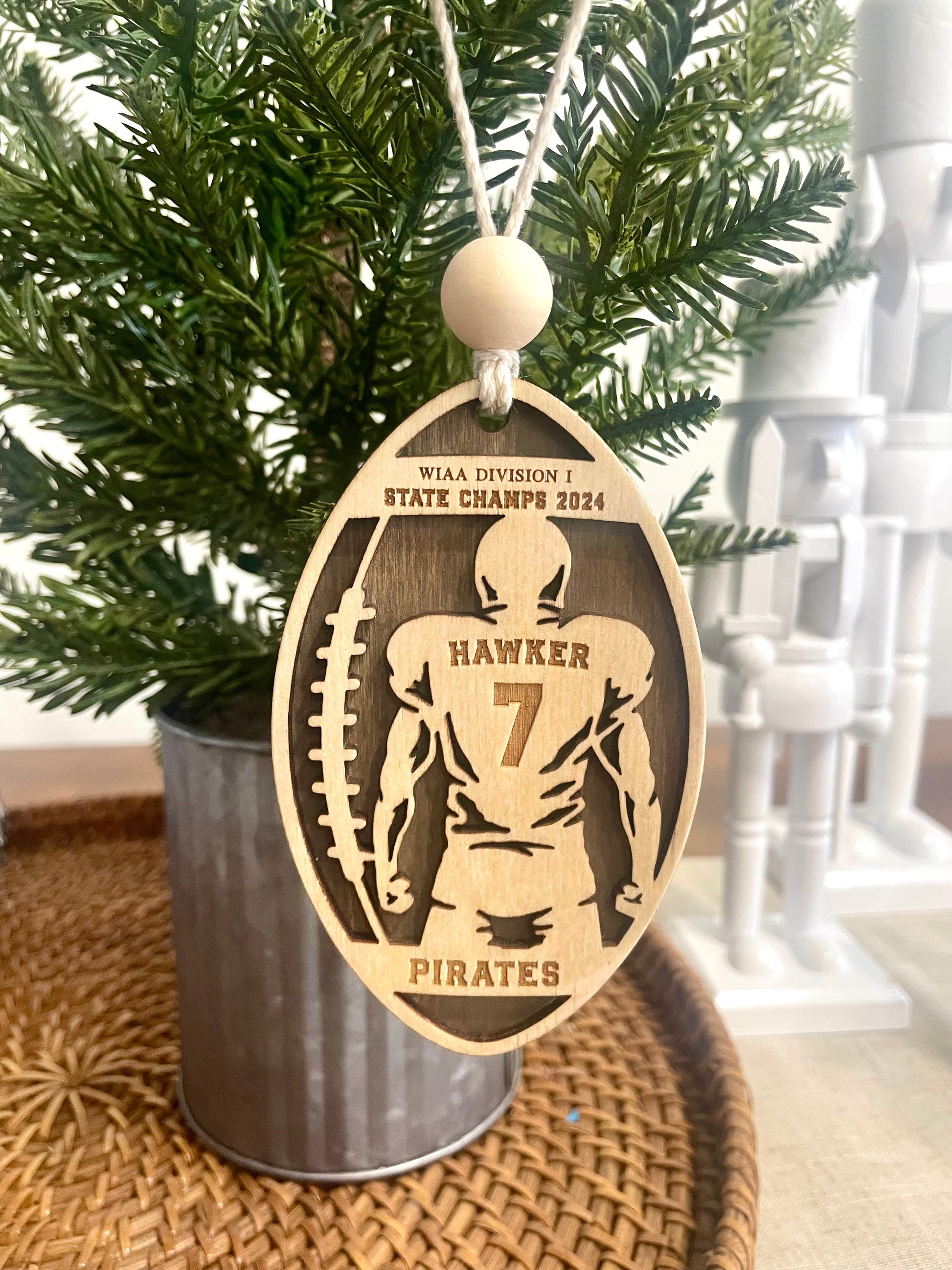 Laser cut personalized wood ornament stained and sealed for a perfect keepsake!