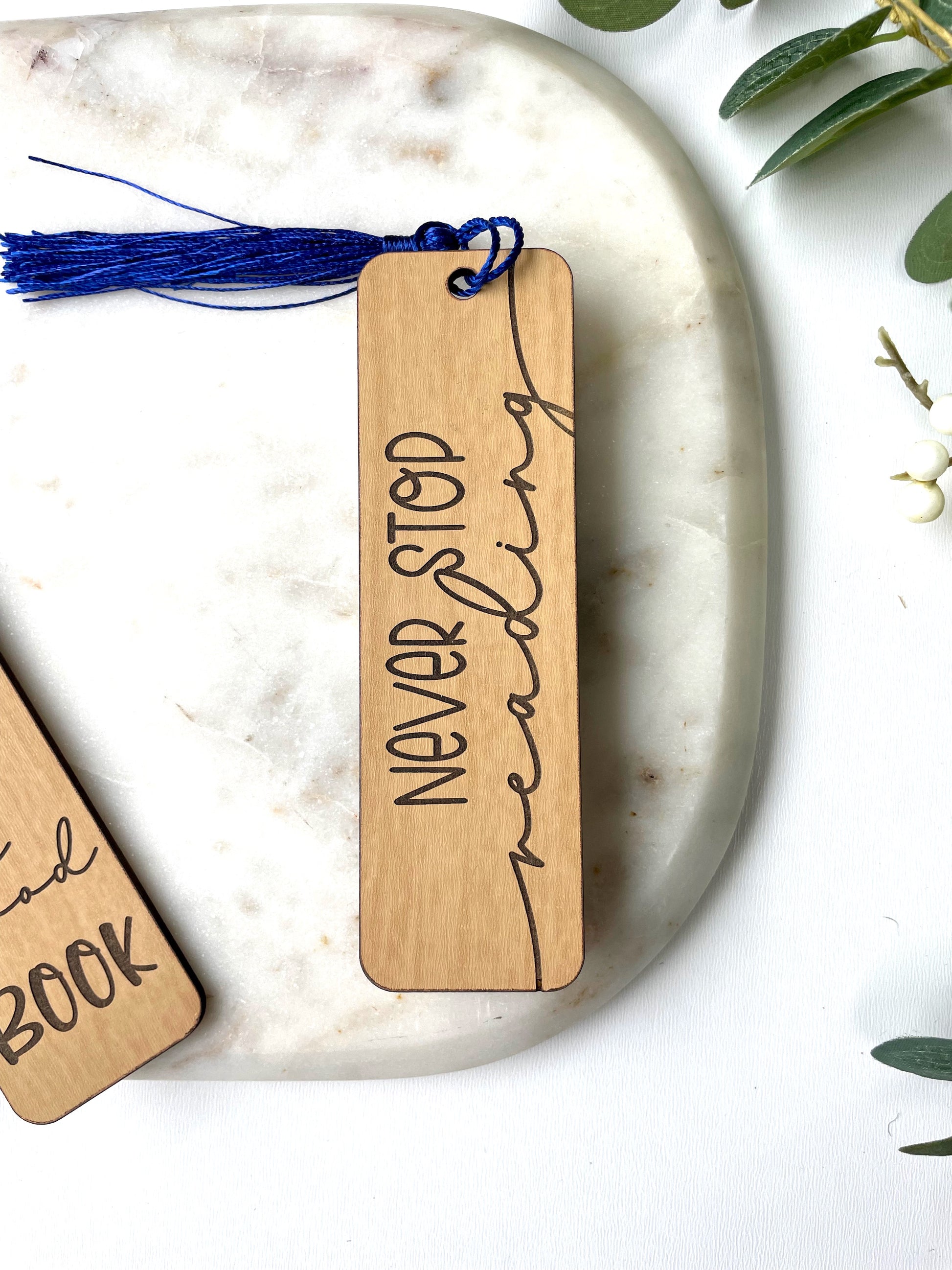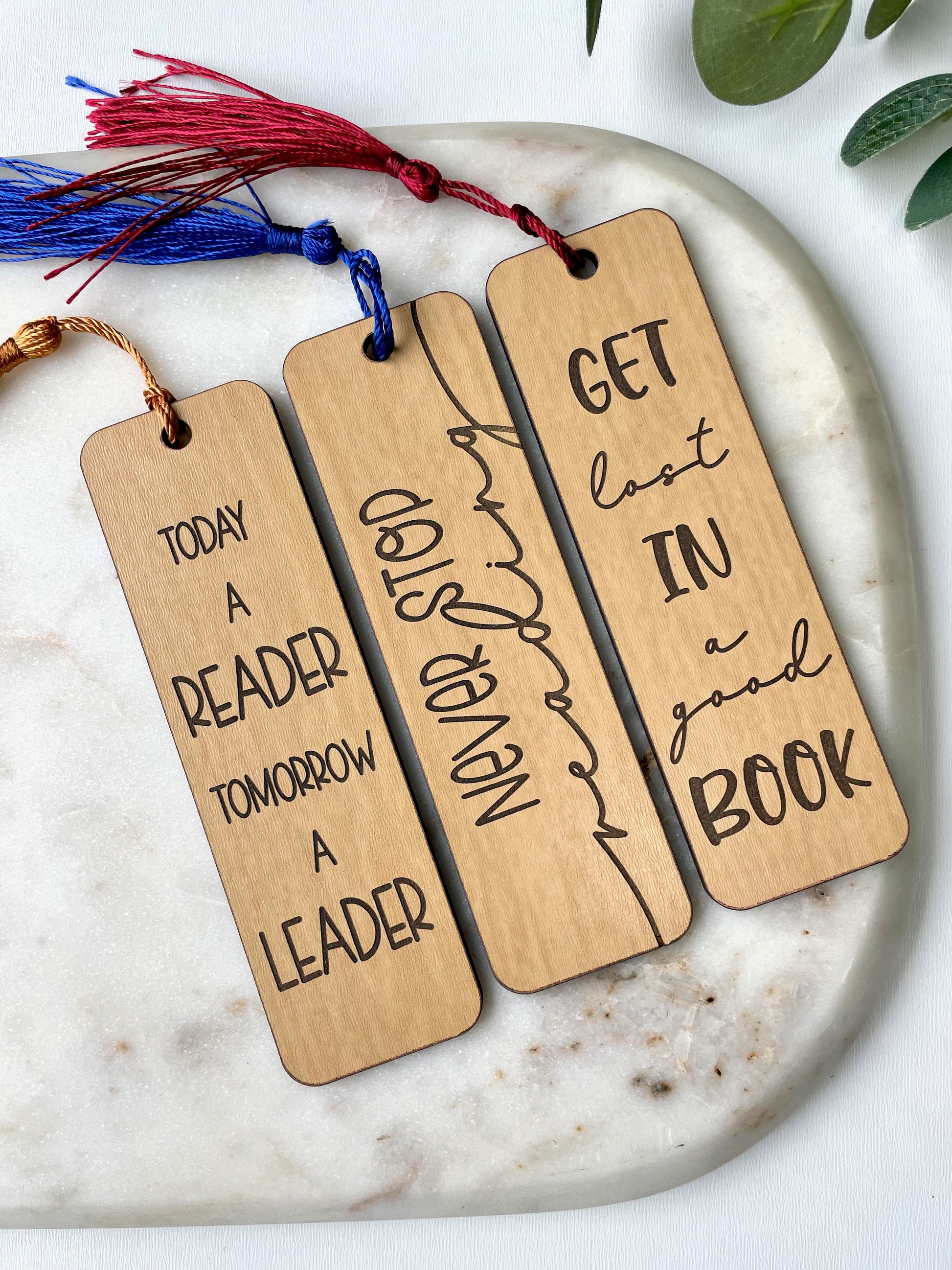 Add a personal touch to your kids reading with our engraved wood bookmarks! Laser engraved on birch wood. Our wood bookmarks make perfect gifts for young book lovers!
