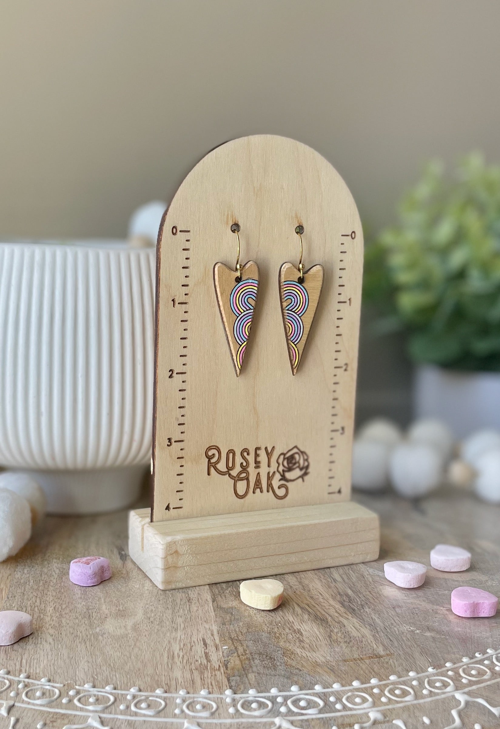 Rainbow Hearts Laser Engraved Wood Dangle Earrings